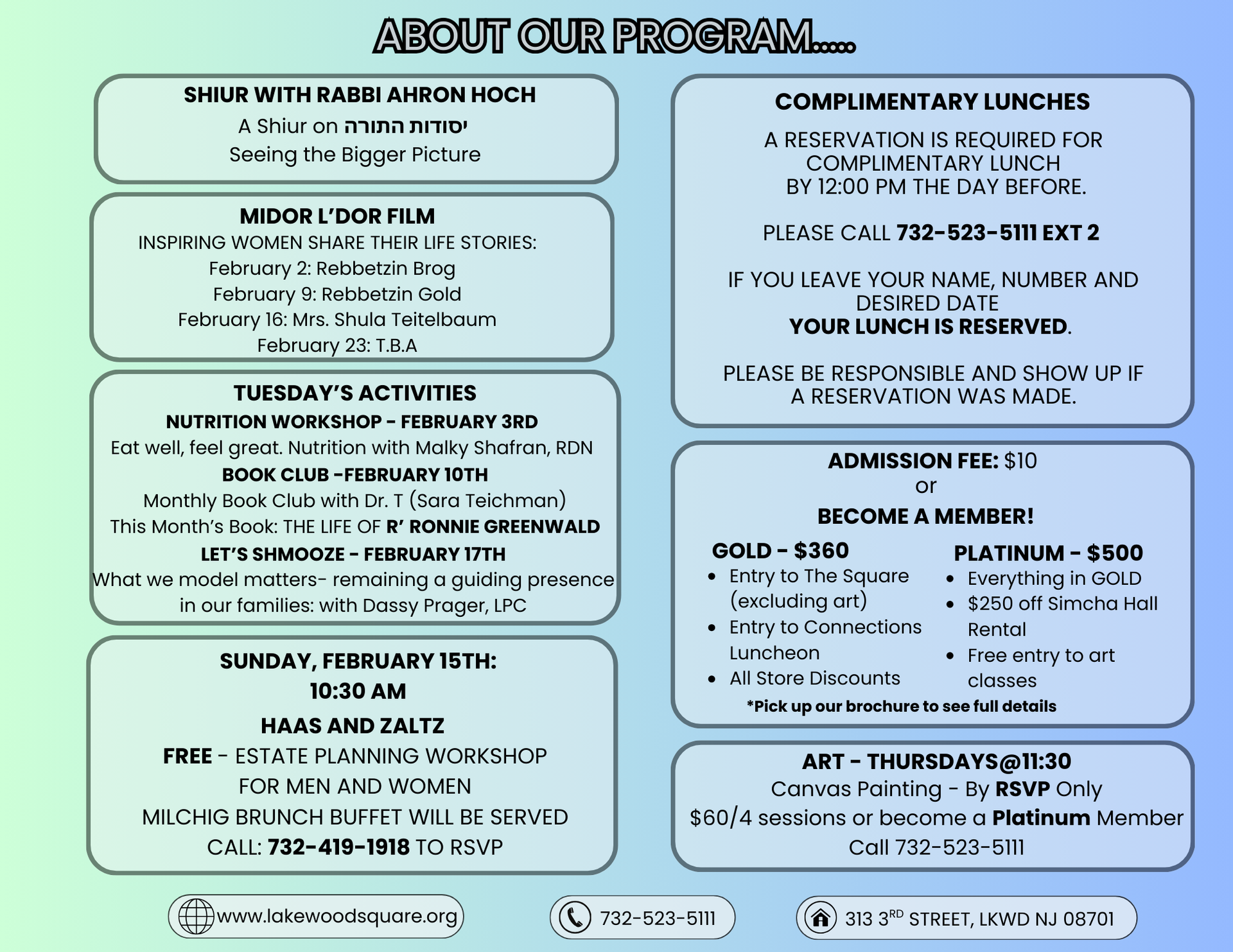 To sponsor a shiur l’iluy nishmas a loved one call 732-523-5111